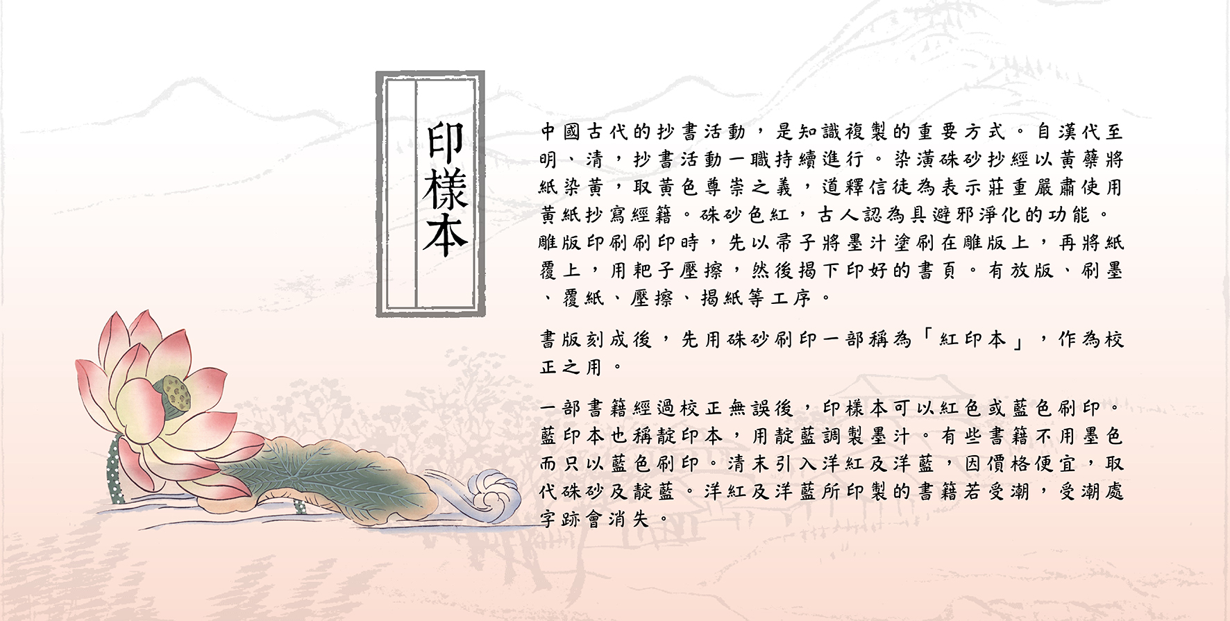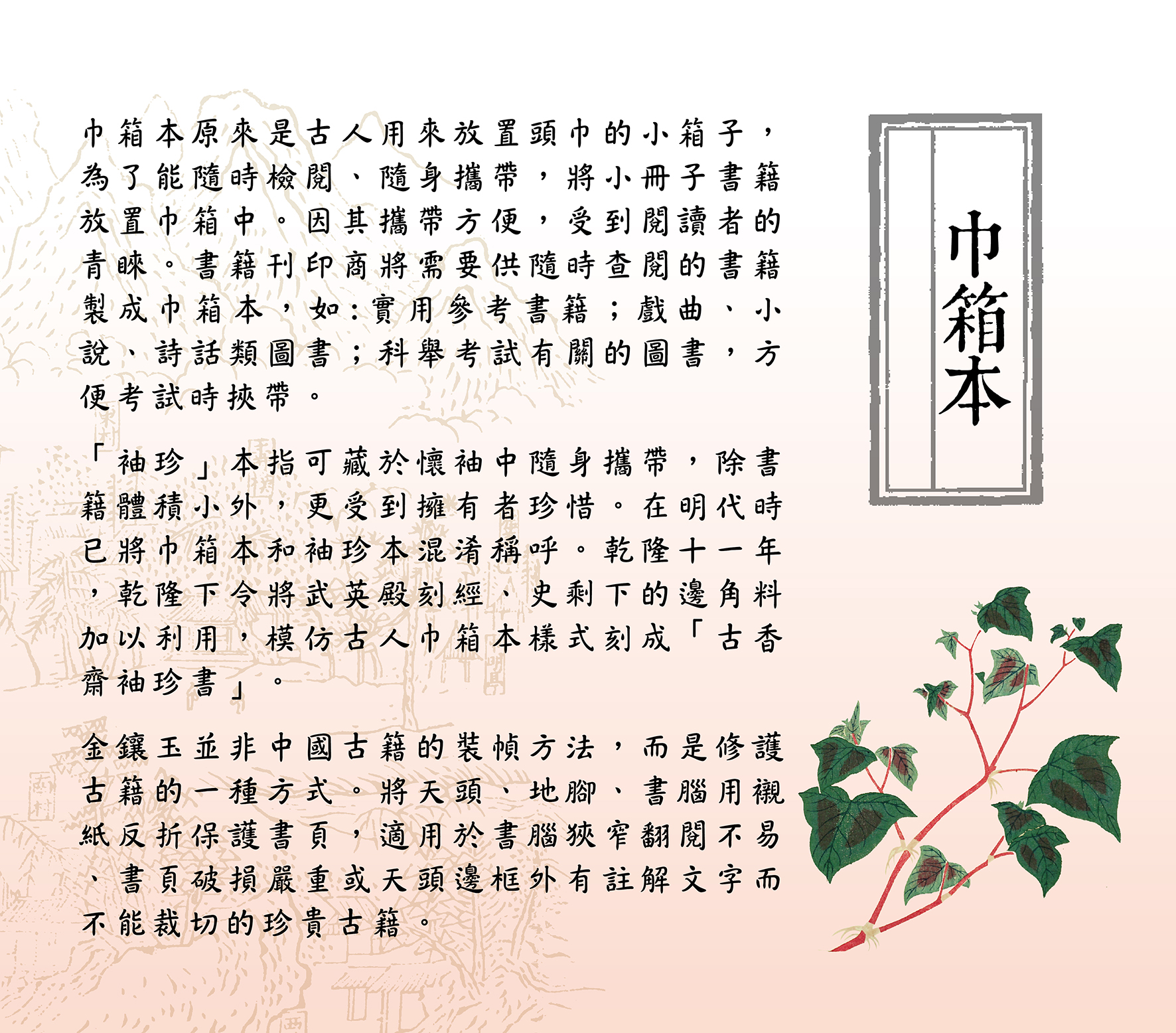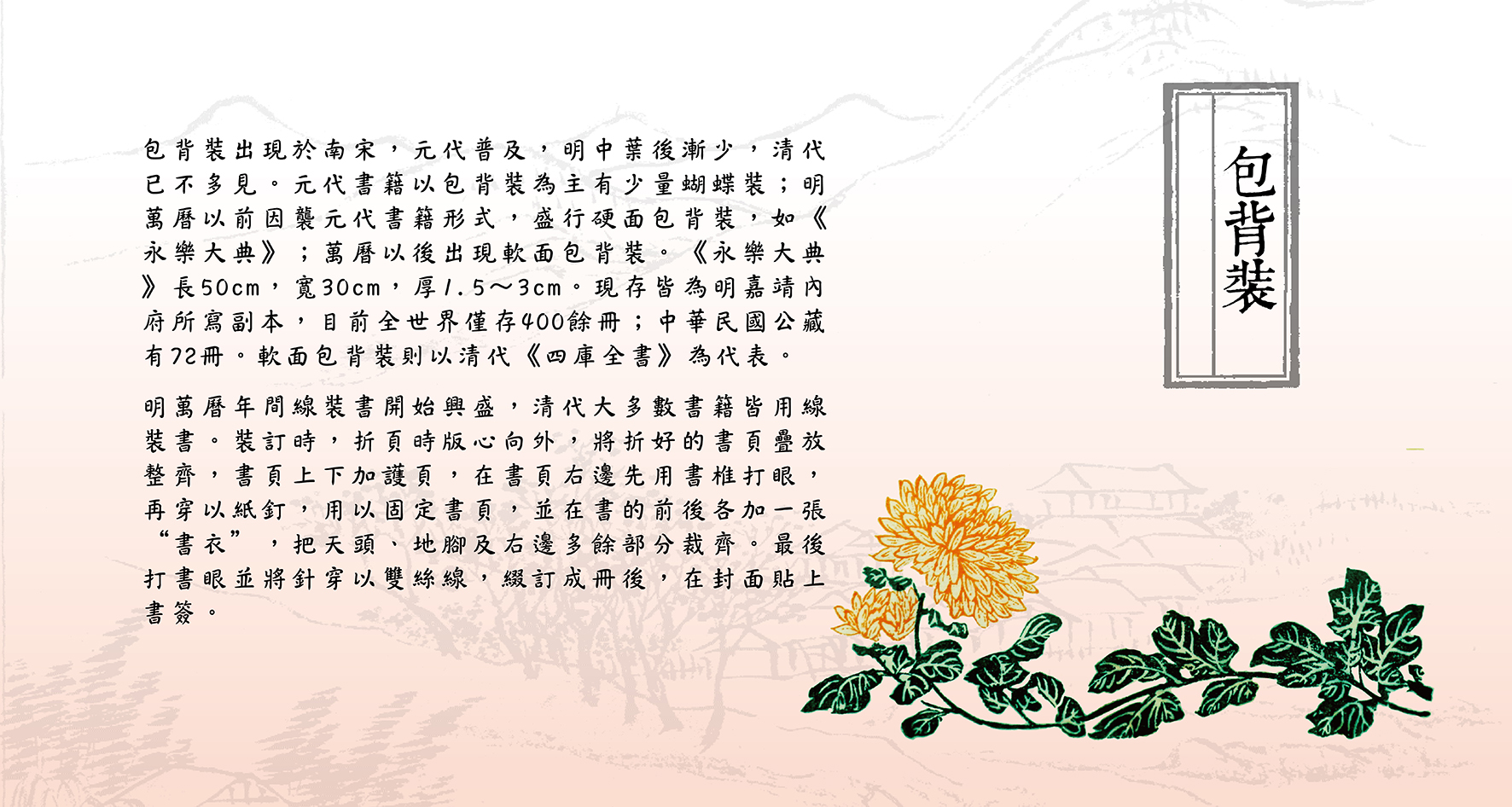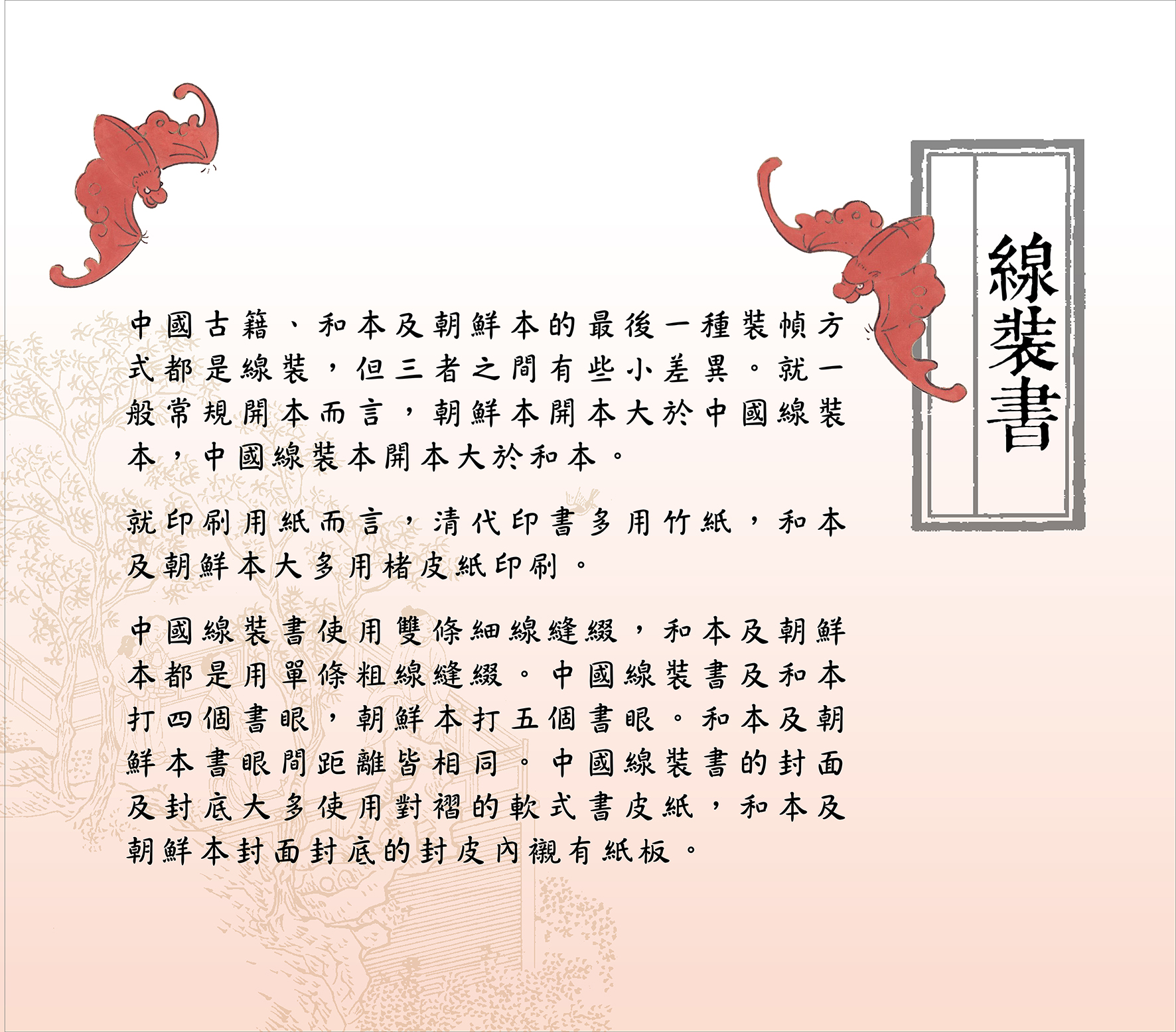 書籍是為傳播知識學問而設;商周尚未產生正式書籍。簡冊上承甲骨金文,當時是圖書的第一種正規形制;之後出現簡冊、縑帛書、帛畫、地圖,而孔子刪詩書,贊周易,訂禮樂,修春秋,刪定六經,其意義為標誌書籍正式產生。後魏帛書減少,六朝出現紙卷軸,唐代出現經折裝,唐末五代出現黏頁、包背和縫綴裝,蝴蝶裝盛行于宋元,至明代中期包背裝盛行,明萬曆年間線裝書開始興盛,清代書籍多為線裝書。本次與民間藏書家合作展出珍貴古典文獻,在時間為古代各式裝幀,空間上橫跨東亞,也包含韓國與日本,值得民眾細細觀賞。